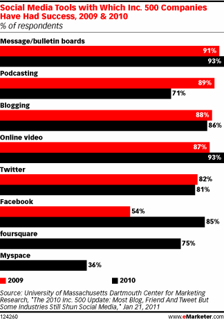 Wanneer een bedrijf social media gebruikt, is succes bijna gegarandeerd. Het meest succesvolle zijn de zogenaamde berichtenborden en podcasts. Foursquare komt uit het niets binnen in 2010 op maar liefst een succespercentage van 75%.