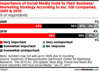 Verschillende bedrijven uit de Inc. 500 (een soort Quote-lijst voor bedrijven) gebruiken sociale media om hun bedrijf en producten te promoten. Een onderzoek naar hun sociale media-gebruik levert interessante cijfers op, meldt e-Marketer.