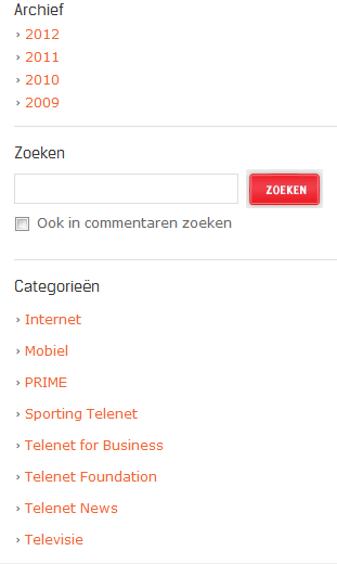 - Ook deze stap is zeker toegepast op de blog van Telenet want er is een zoekfunctie aanwezig. Logischerwijze ben ik eerst bovenaan de webpagina gaan kijken of deze knop bestond. Na eventjes verderzoeken, vond ik hem aan de rechterkant halverwege de pagina. Naast het ingeven van zoekacties, kan mijn ook zoeken binnen een bepaald archief en volgens een bepaald onderwerp.